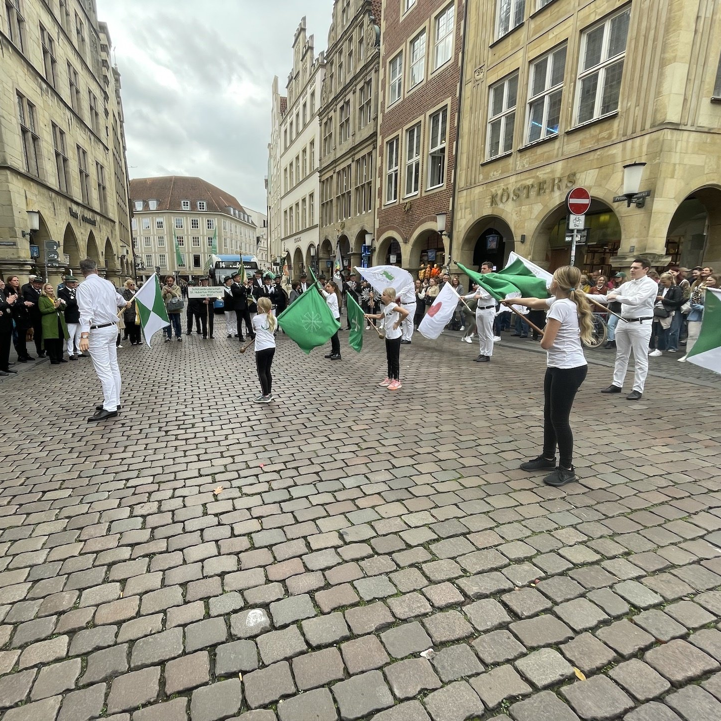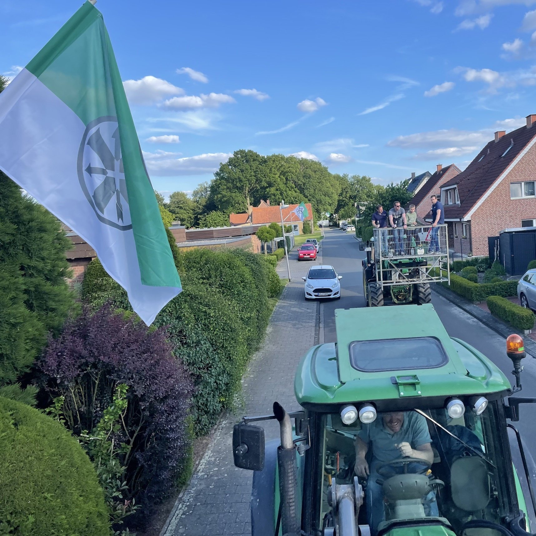 Und dann lebt auch eine weitere Tradition bei uns wieder auf: der Fahnenschlag. Das Schwenken der großen, weiß-grünen Schützenfahnen hat eine lange Tradition und ist immer eine sehenswerte, mit passender Musik unterlegte Choreographie. Es sind insbesondere viele Mädchen und Jungen aus dem Schützennachwuchs, die hier wieder aktiv werden und regelmäßig trainieren.
